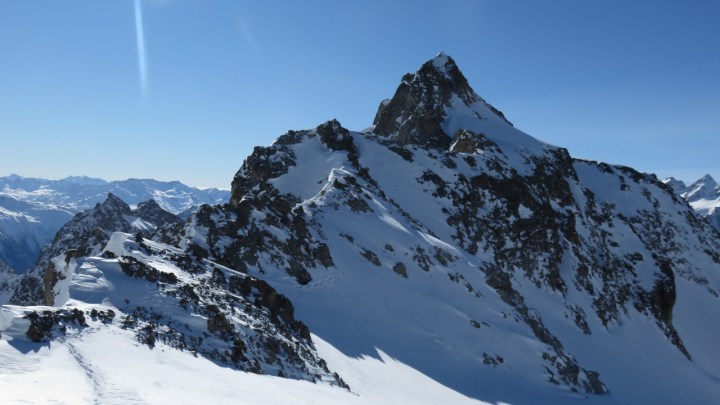 Kurz nach sieben starteten wir auf der Sustenpassstrasse und liefen durch den frischen Schnee auf einer eben angelegten Spur durch den Färnigwald nach Rieter hinauf. Die Spur bog bald darauf ab zur Sewenhütte und wir zogen nun eine Spur durch den herrlich fluffigen Schnee. Für die steilen Passagen wurden bald die Harscheisen montiert, der frische Schnee rutsche etwas ungünstig auf der harten Unterlage weg. Durch den 10-15cm tiefen Schnee zirkelten wir anschliessend eine Spur die breite Gletschermulde hinauf und erreichten bald den Fuss den Gipfelaufbaus. Rechts des Felssporns stiegen wir zu Fuss durch guten Trittschnee hinauf auf den Grat und hatten nach wenigen Minuten den Gipfel des Bächenstocks 3010m erreicht. Die Querung unter dem Gipfel hindurch und über den Grat zu P.2911 war auf teils guten Trittschnee gut zu machen. Als Variante entschieden wir uns, den Felskopf links zu Fuss zu umgehen – zunächst war’s recht angenehm, aber die abschliessende, sehr steile und abfallende Querung in die Scharte war dann doch nicht so toll – das nächste Mal lieber wieder rechts über den Gletscher, auch wenn man dort mehr schwitzen muss…