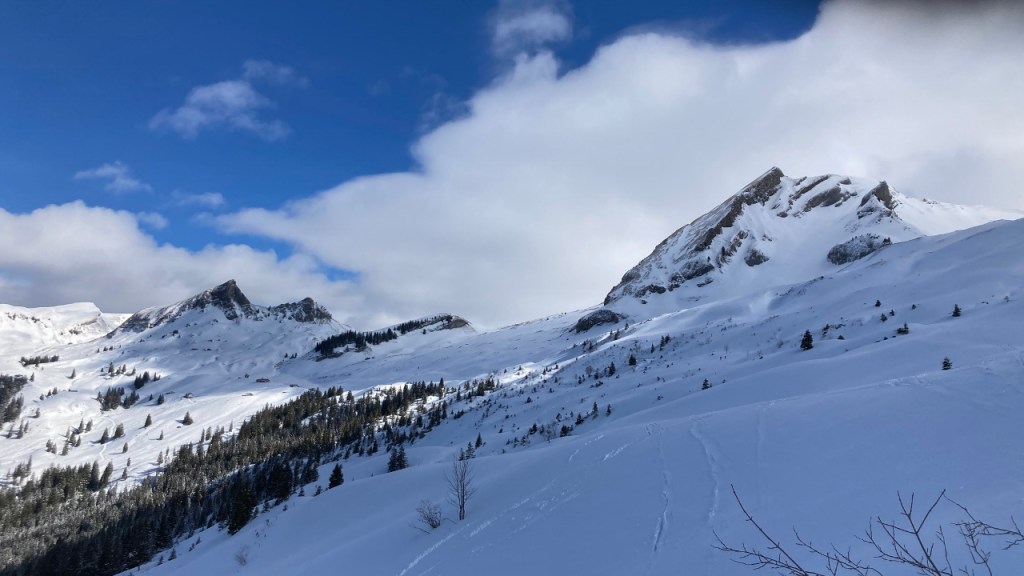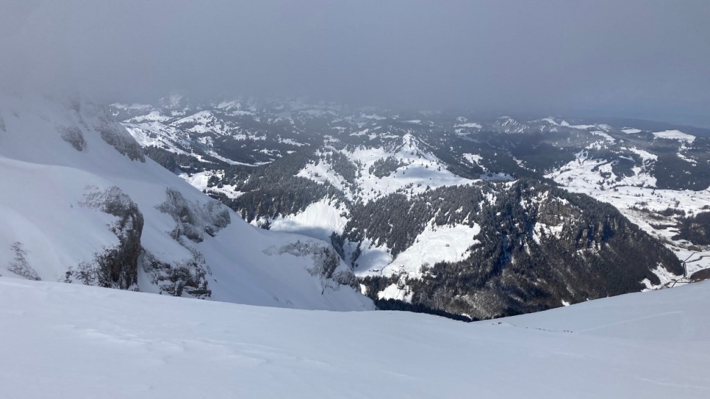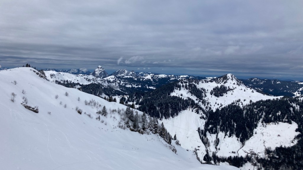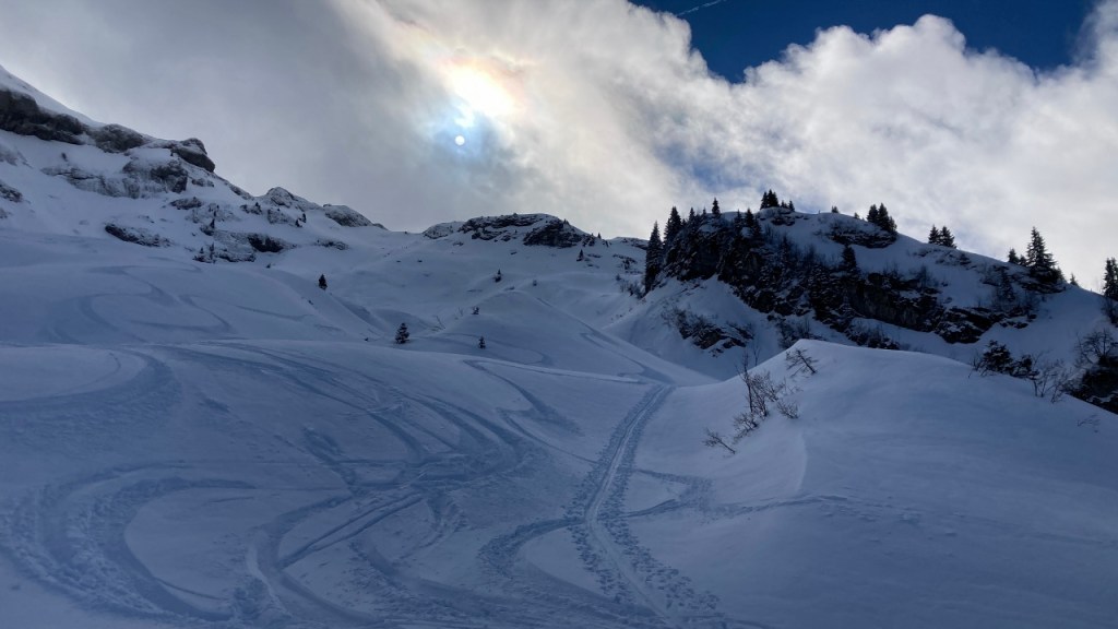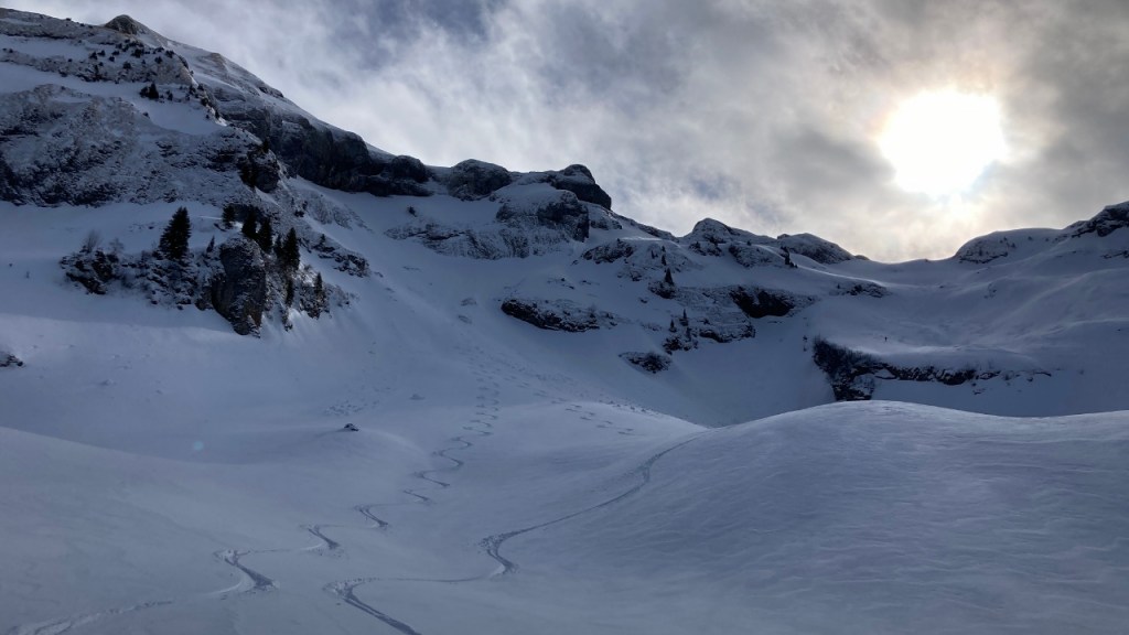 Nachdem der Tag erst über Mittag etwas Sonne bereithalten sollte, startete ich erst um 9:30 Uhr in Weglosen und lief zunächst auf der Forststrasse, dann auf frischer Spur hinauf zur Lücke P.2108 zwischen Forst- und Drüesberg. Da sich der Gipfel des Forstbergs noch in dicke Wolken hüllte und ich den Gipfelhang nicht so sonderlich einladen fand nach dem frischen Schneefall, fuhr ich durch teils wunderbaren Pulver, teils etwas windgedeckelten Schnee hinab bis ca. 1550m zwischen Sädel und Steinhüttli. Nachdem ich die Felle wieder montiert hatte, lief ich hinauf zu P. 2011 oberhalb der Schäflöcher. Hier tankte ich etwas Sonne, bevor ich die wunderbare Abfahrt an den vorherigen Anfellpunkt genoss. Weil es so schön war und die heraufziehende Front noch etwas entfernt, stieg ich ein drittes Mal auf, diesmal in den Kessel unter P.2033 bis auf ca. 1800m. Ich legte eine zweite Spur neben meine von vorhin und fuhr dann gut gelaunt hinab ins Tal.