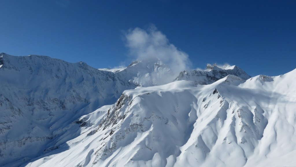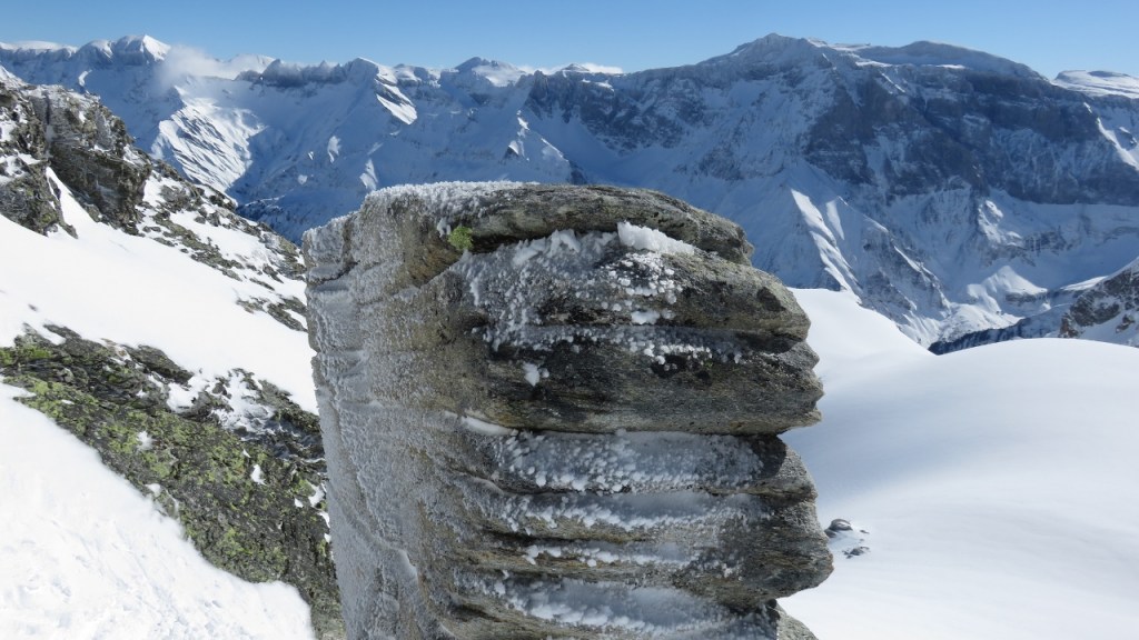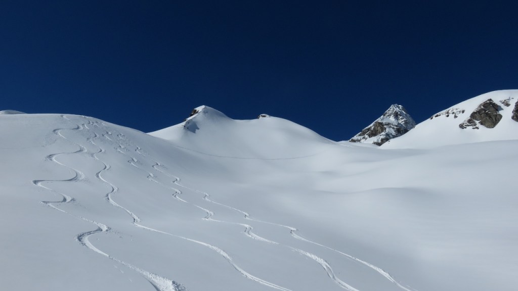 Und wieder so ein Tag, der zunächst noch Schneefall bis in die Morgenstunden auf dem Programm hatte. Aber man ist ja flexibel… Da ich auf den Weg nach Osten eine Station machen wollte, lief ich mal wieder auf den Chli Chärpf. Trainingspunkt heute: kiloweise Stollen schleppen! Der frische Neuschnee der Nacht wurde schnell durch die Sonne erwärmt und ab der Skihütte Obererbs war es teils eine grosse Freude, die Skier samt der zusätzlichen Last bergan zu stossen. Nun ja… der viele Wind der letzten Tage hatte aber eine hübsche Rampe auf der Südseite des Chli Chärpfs geschaffen, auf der ich noch problemlos in der frischen Spur zum Gipfel gelangte (2h40min). Als Abfahrtsvariante entschied ich mich heute für die Hänge am Erbser Chärpf und fand noch wunderbaren Pulverschnee vor. Da die Beine wegen dem Stollen-Schlepp-Training ziemlich müde waren, verzichtete ich auf einen zweiten Aufstieg und fuhr ins Tal.