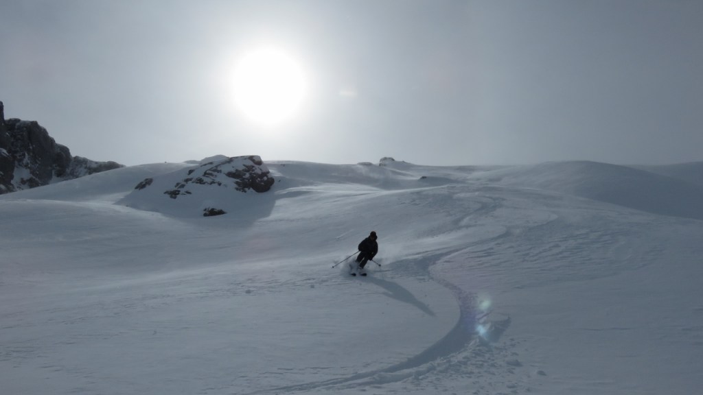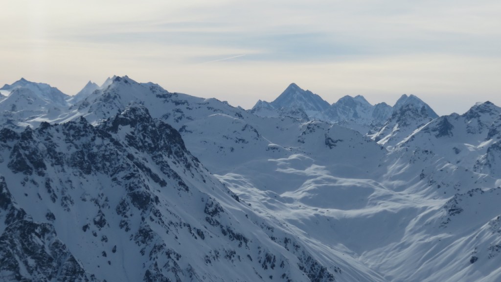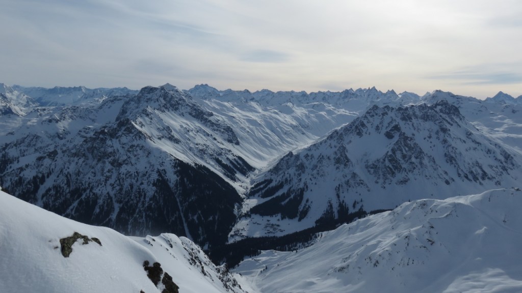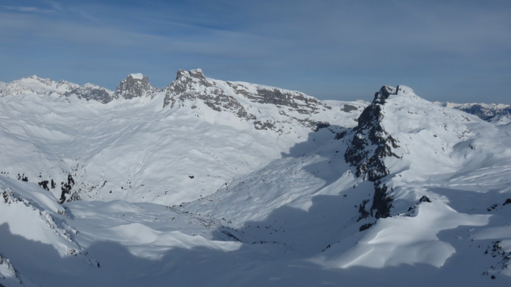 Nach einer sternenklaren Nacht, zogen morgens einige dünne Schleierwolken über St. Antönien auf, die aber nicht weiter störten. Gegen 7:15 Uhr machten wir uns auf den Weg und liefen über Dörfji am Alpeltibach entlang hinauf zum Riedchopf. Auf dem Grat fegte ein unangenehm kalter und zunehmend starker Wind über uns hinweg, bis wir den Gipfel erreichten. Da uns das steile Tälchen hinab zu P.2294 mit zuviel Triebschnee gefüllt aussah, änderten wir unsere Pläne und fuhren entlang der Aufstiegsspur und später in den Nordhängen der Gämpiflue hinab nach Dörfji. Hier wurden die Fellen wieder angeklebt und auf guter Spur liefen wir auf der anderen Talseite hinauf zur Hasenflüeli. Der Gipfelanstieg war problemlos ohne Pickel und Steigeisen möglich. Anschliessend fuhren wir hinab zu P.2340, wo wir auf der rechten Seite des Sattels einen Durchschlupf durch die Wächte fanden. Zunächst etwas vorsichtig den Geländerücken folgend, später in den weiteren Hängen fuhren wir genussreich durch wunderbaren Pulverschnee hinab ins Tal und erreichten wenig später den Ausgangspunkt. Vielen Dank an A.B. für diese herrliche Tour!