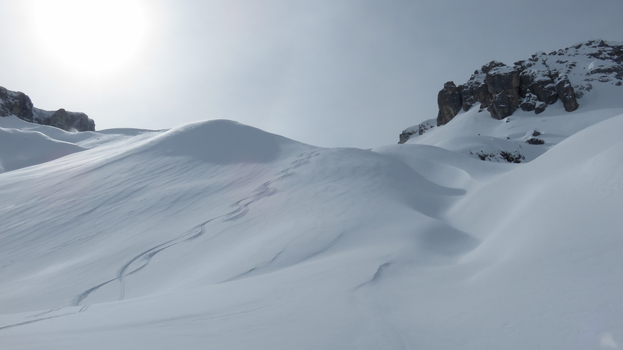 Nach einer sternenklaren Nacht, zogen morgens einige dünne Schleierwolken über St. Antönien auf, die aber nicht weiter störten. Gegen 7:15 Uhr machten wir uns auf den Weg und liefen über Dörfji am Alpeltibach entlang hinauf zum Riedchopf. Auf dem Grat fegte ein unangenehm kalter und zunehmend starker Wind über uns hinweg, bis wir den Gipfel erreichten. Da uns das steile Tälchen hinab zu P.2294 mit zuviel Triebschnee gefüllt aussah, änderten wir unsere Pläne und fuhren entlang der Aufstiegsspur und später in den Nordhängen der Gämpiflue hinab nach Dörfji. Hier wurden die Fellen wieder angeklebt und auf guter Spur liefen wir auf der anderen Talseite hinauf zur Hasenflüeli. Der Gipfelanstieg war problemlos ohne Pickel und Steigeisen möglich. Anschliessend fuhren wir hinab zu P.2340, wo wir auf der rechten Seite des Sattels einen Durchschlupf durch die Wächte fanden. Zunächst etwas vorsichtig den Geländerücken folgend, später in den weiteren Hängen fuhren wir genussreich durch wunderbaren Pulverschnee hinab ins Tal und erreichten wenig später den Ausgangspunkt. Vielen Dank an A.B. für diese herrliche Tour!
